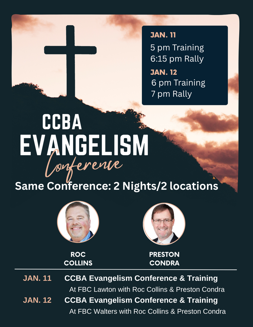 CCBA personal evangelism training and rally January11-12. We will have this in 2 locations in our association. It will be the same program for each location, so you can pick which night and which location that is best for you and your church. Pastor, this can be a great help to you and your ministry to equip and inspire the people in your church for the Gospel in your context. This event is free to all because of your faithful support of CCBA. This event is priority because of what Jesus said is to be our priority.