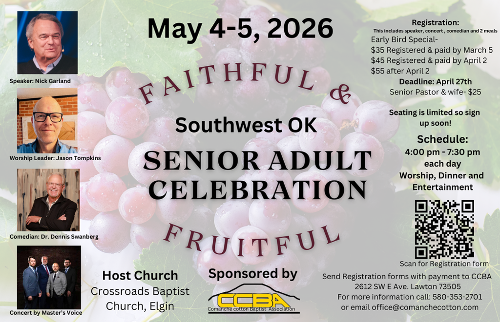 Sign up and pay for our Southwest Senior Adult Celebration by April 27th. $35 Early bird discount ends March 5 and $45 early bird price ends April 2. From April 3-27 it is $55 per person. Includes worship, two meals and 2 nights of entertainment. Senior pastor and wife $25.